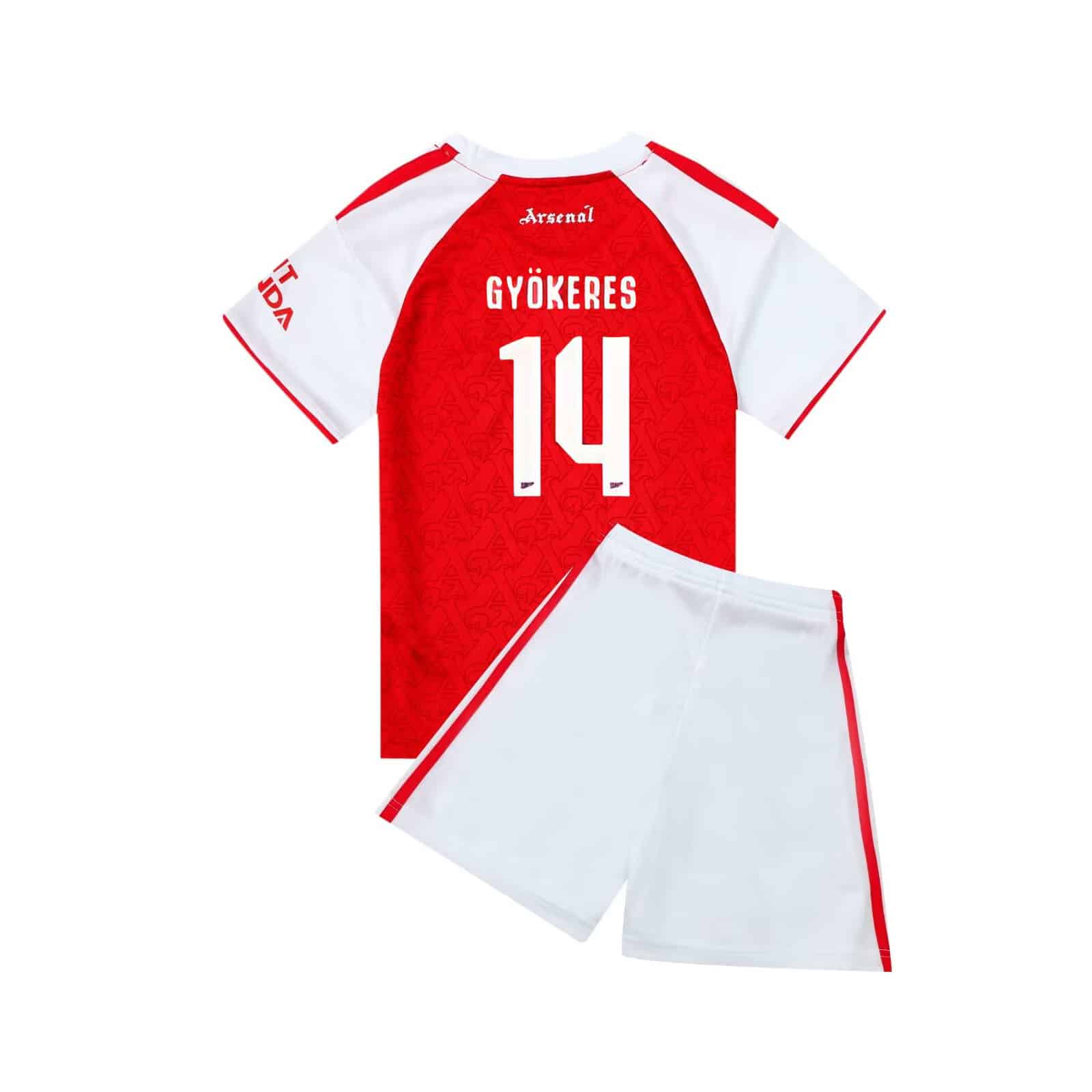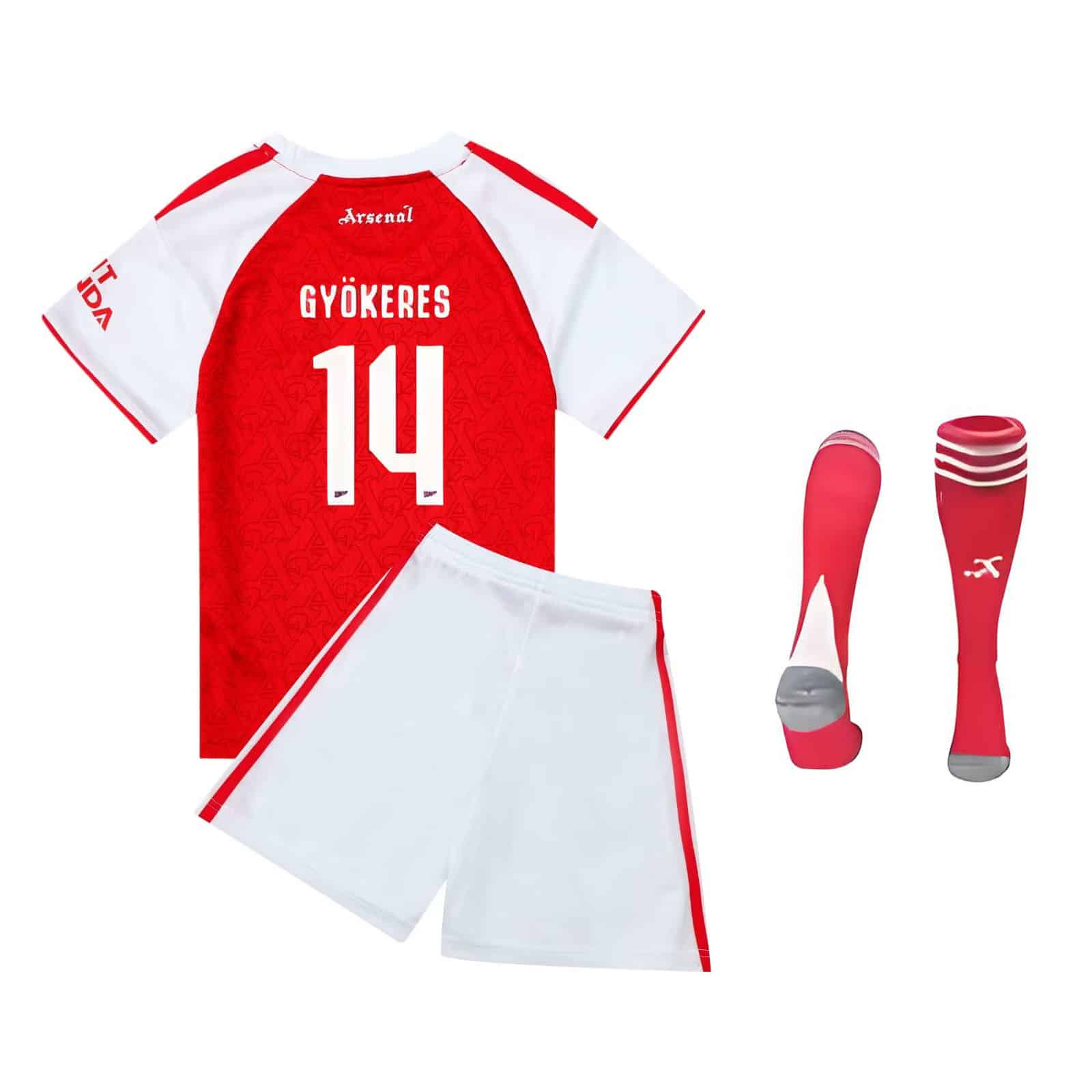 Detta stilrena set är inspirerat av Arsenals klassiska hemmatröja och hyllar Viktor Gyökeres – en av Sveriges mest kraftfulla och målfarliga anfallare. Tröjan har Gyökeres namn och nummer tryckt på ryggen, vilket gör att barn kan känna sig ännu närmare sin favoritspelare.